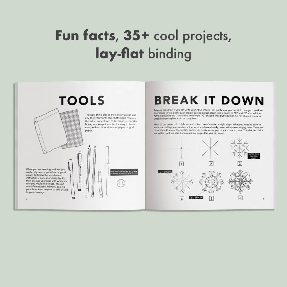 Perfect for budding artists and kids who have never drawn before, this beginner drawing book will teach your kid how to draw fun winter-themed pictures in no time! Author and professional artist Alli Koch’s kid-friendly, mini drawing lessons will help your child practice their basic art skills and teach them how to draw with confidence.