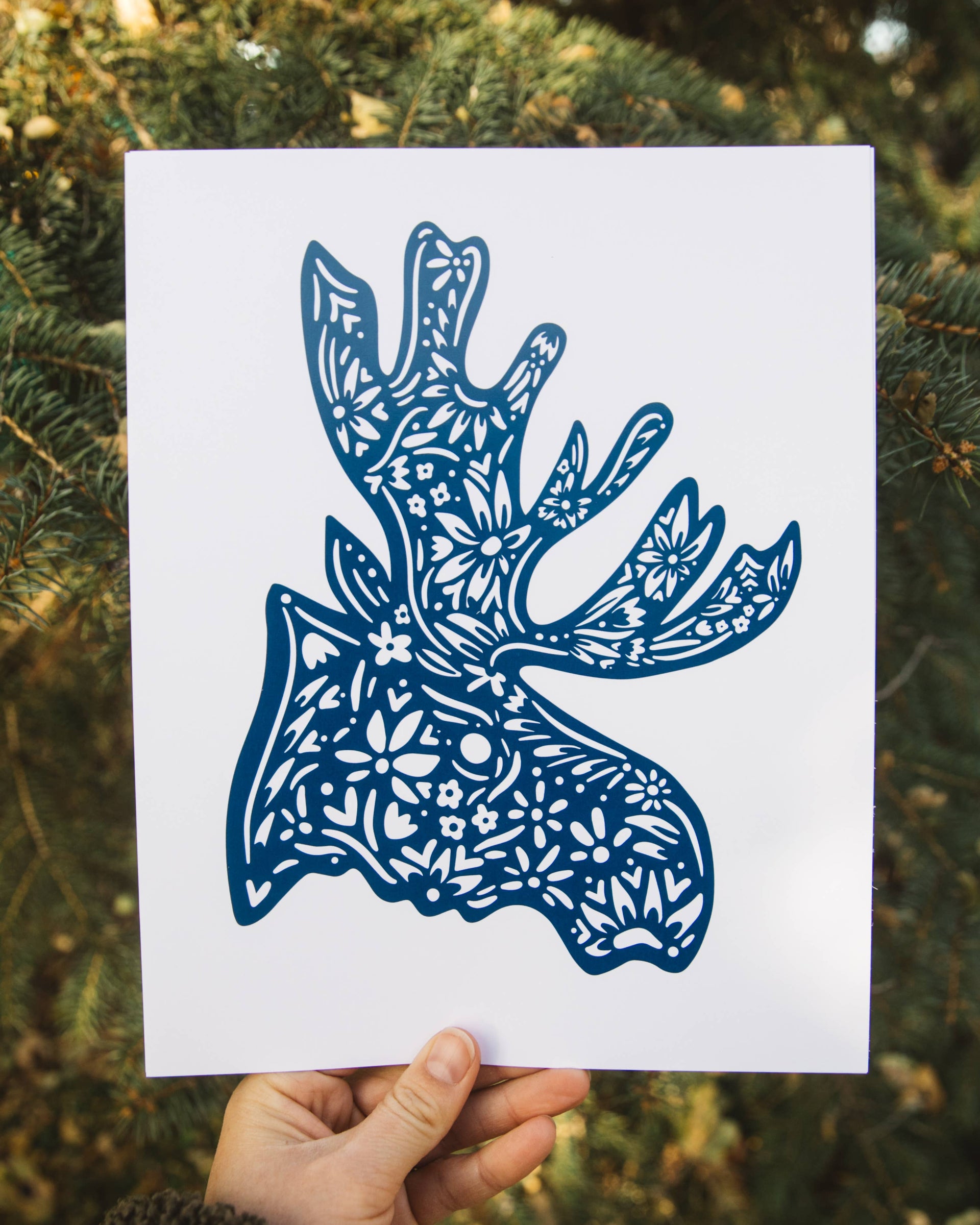 Hand drawn floral nordic inspired moose wall art. Available in 8x10 or 5x7, in blue & white or blue multi colored. A cute nod to the wilderness!