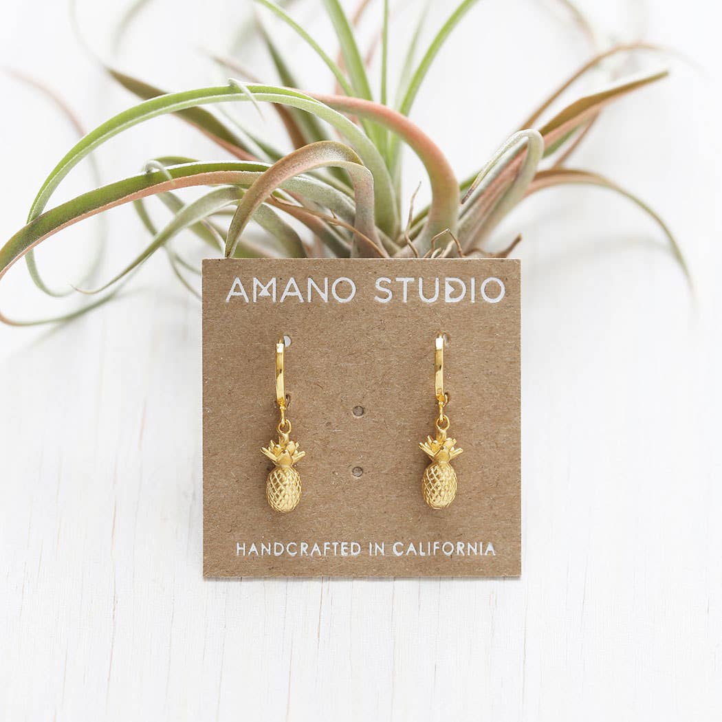 Adorable little pineapples hang from 14mm huggie hoops. This S/S season will be filled with adorable fuit themed acessories. Pineapples always signify happy, warm and sweet. Made of 14k gold plated brass. Designed and assembled in our Sonoma California studio.