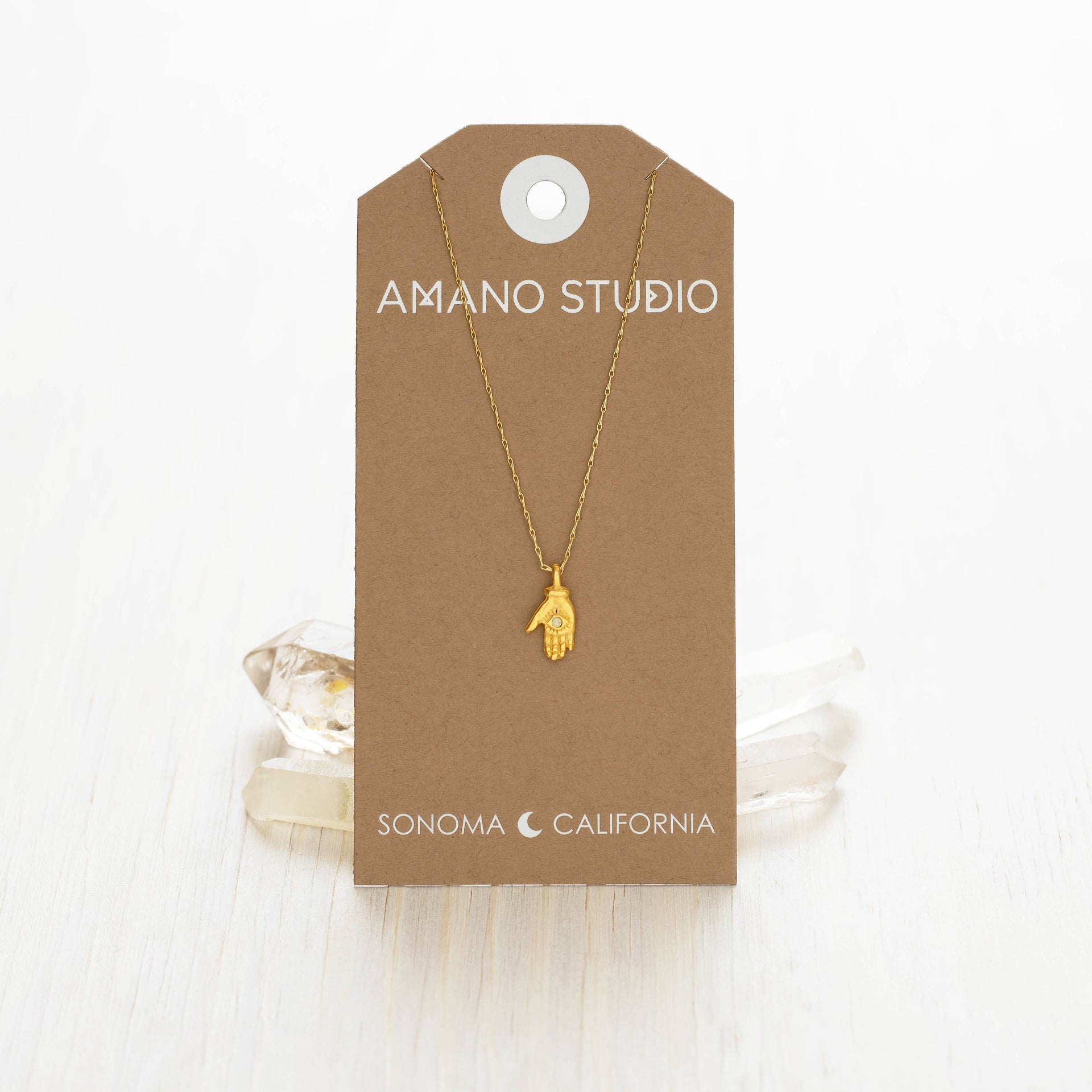 The tiny hand pendant measures approximately .5" and it's set with a Czech crystal in "opal" and hangs from an 18" 14k gold plated brass chain (coated to resist tarnish and create a hypoallergenic surface). Designed and assembled in our Sonoma California studio The symbol of a hand with an eye in the palm appears in many cultures and forms. Most commonly, the Hamsa symbol is for protection and to ward off the evil eye. These mystic hands were designed to represent creativity and the artistic connection between the hands and the eyes.