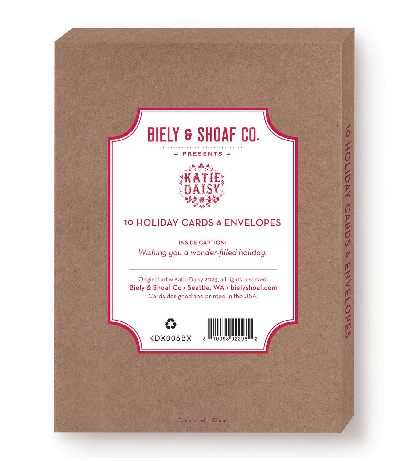 Inside verse: Wishing you a wonder-filled holiday.  • 10 cards and envelopes • Illustrated by Katie Daisy • Size: A6, 4.6" x 6.4" • Full-color inside • Envelope color: Brown Kraft • Printed in the USA on high-quality recycled paper About the artist: Katie Daisy was raised by the birds and warm breezes of small-town Lindenwood, Illinois, brought up among the wildflowers with roots planted deeply in the natural world. She found her voice and honed her skills at the Minneapolis College of Art and Design, graduating in 2009 and subsequently beginning an adventurous career as a freelance illustrator. Working in watercolor and acrylic paint as well as mixed media materials, Katie strives to capture the magic and beauty of a life lived in harmony with nature.