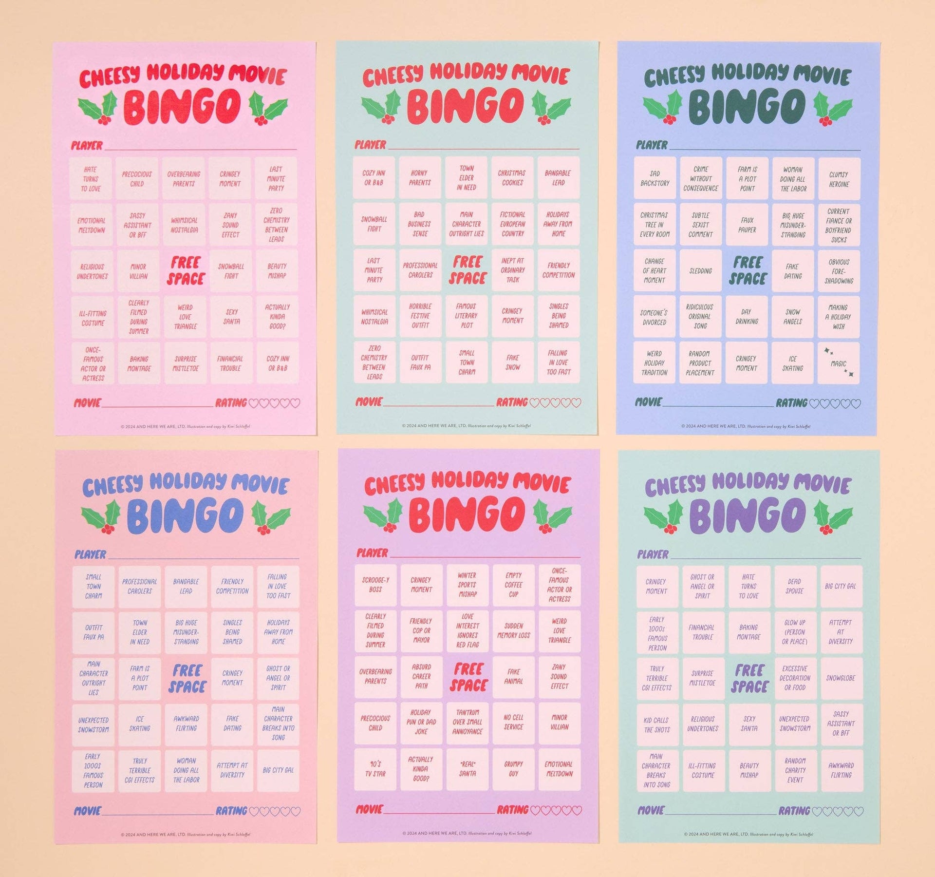 Love them or hate them (or love hating them), those cheesy made-for-tv holiday films are a must-have for the holiday season. Add some extra fun and interactivity to your movie marathon with Cheesy Holiday Movie Bingo! Mark off classic Hallmark Movie clichés such as, "hate turns to love," "clearly filmed during summer," "zero chemistry between leads," and "farm is a plot point." The game gets even sillier when the winner dons an award ribbon that states "I won Cheesy Holiday Movie Bingo and now I have to wear this stupid ribbon for the rest of the night." Just add your favorite cheesy holiday movie! CONTENTS • 36-page notepad with 6 unique layouts • Sticker sheet • Award ribbon • Instruction card ABOUT •1-6 players • Not recommended for children (some adult themes) • Made in USA • Words and illustrations by Kiwi Schloffel -Your Gal Kiwi for And Here We Are