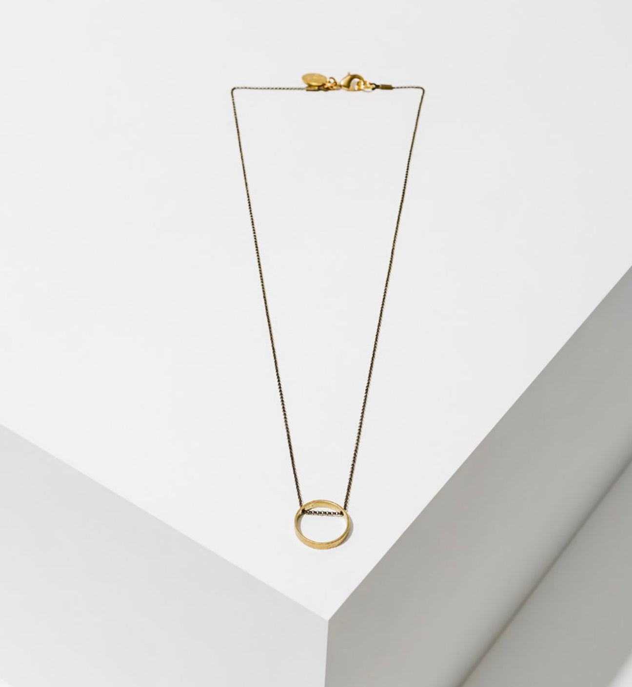 Geometric shapes threaded with delicate antiqued chain. Necklace 18 inches long with clasp.