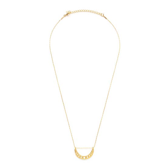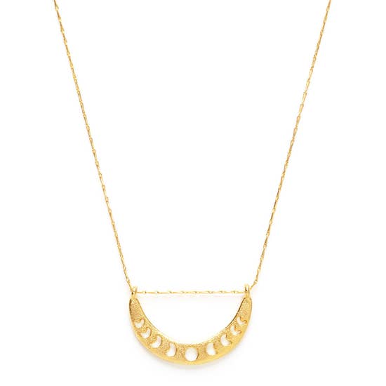 This crescent is threaded on 16" barley chain with a 2" extender so you can adjust it to the perfect length! 14k gold over brass. Designed and assembled in our Sonoma California studio.