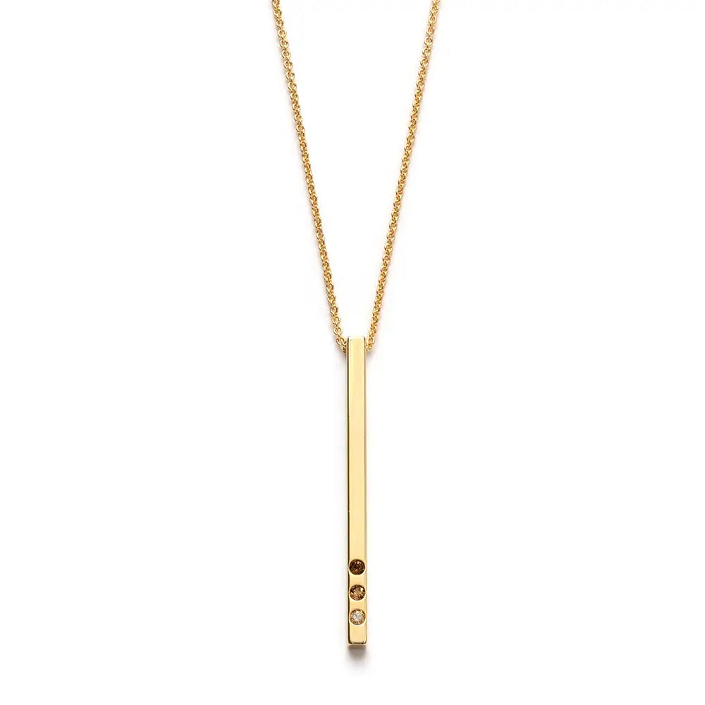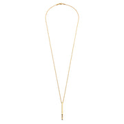 This sleek, modern pendant, a 2" gold bar on 30" gold plated chain with an earthy ombre of crystal, is an elegant, everyday accessory. 14k gold plated chain, Czech crystals. Designed and assembled in our Sonoma California studio.