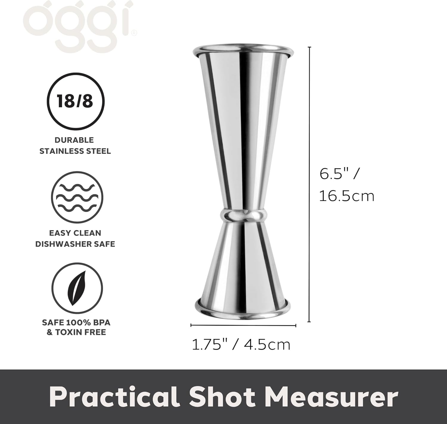 Oggi's double cocktail measuring jigger has both 1 oz and 2 oz capacity jiggers with external markings for easy identification.