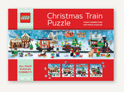 - LEGO® Christmas Train puzzle – Build 4 individual 100-piece puzzles that can be connected to create a large winter scene featuring a train, snow-capped houses and sledging minifigures