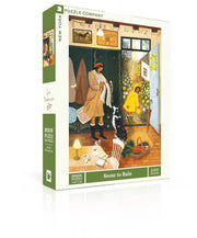 Snow to Rain is a 500 piece jigsaw puzzle illustrated by Loré Pemberton, capturing the gentle shift from winter to early spring. A bundled family steps inside as the last chill lingers, while bright spring flowers bloom just beyond the open door.