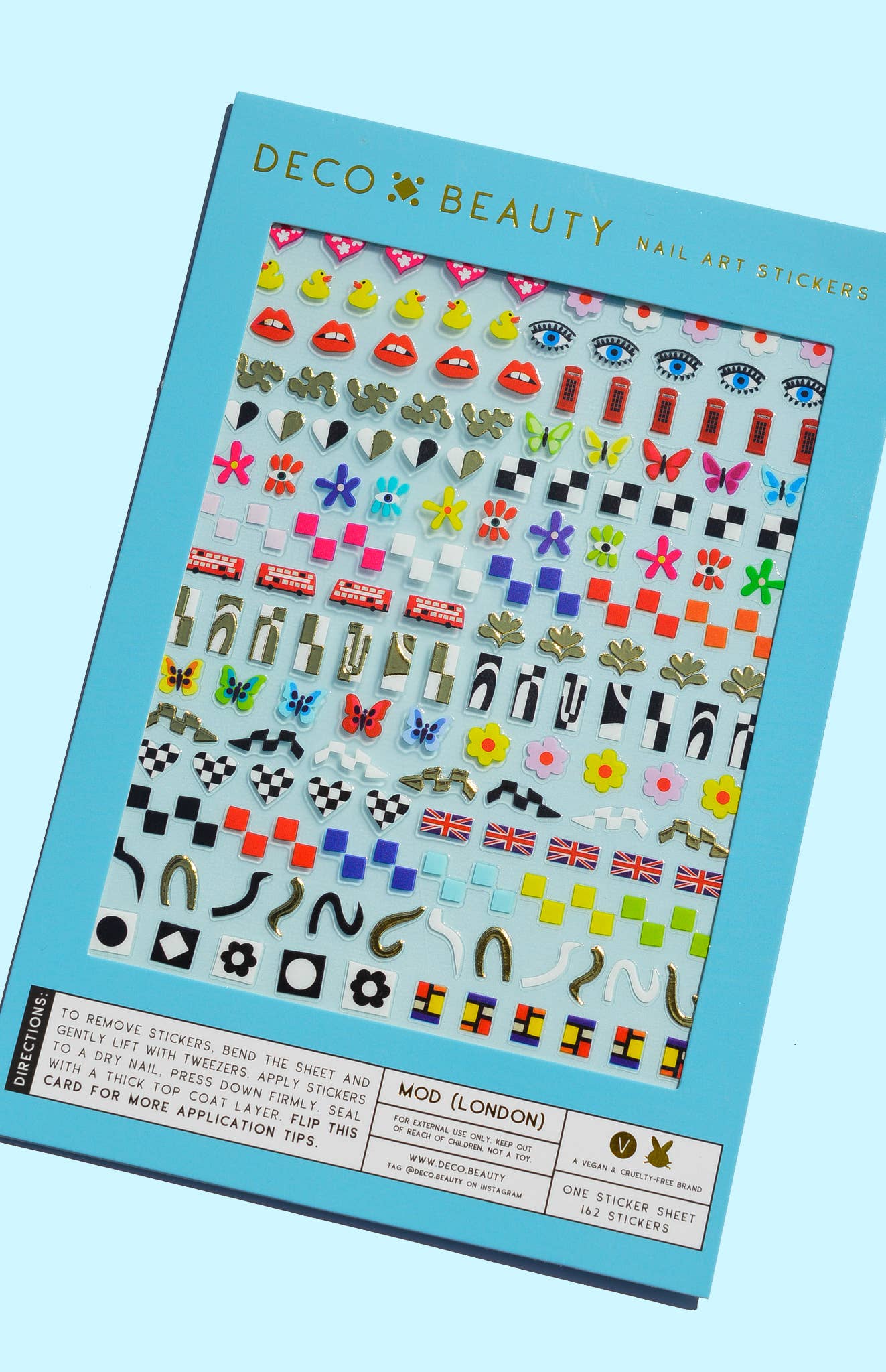 Nail art just got way easier. These tiny stickers were made to be easy to remove from their sheets and press right onto your nails. They can be applied to gelled, polishes, or natural nails, just make sure that whatever surface you're putting them on is dry. Oh, and don't be a hero; use tweezers to remove stickers from sheets. They are thin, so take your time and be gentle. Application directions and tips are printed on the back of packaging if you need additional guidance. For best results, use a thick top coat (Deco's Gel Effect Plumping Top Coat was specifically designed in mind for this job) to seal the sticker on your nail. You may need to put an extra coat overtop of gold metallic stickers. Keywords: 60s, London, Mod, checkered, checker, heart, groovy, rubber ducky, phone booth, Twiggy, eye, bus, heart, abstract, minimalist, maximalist, swirls, contemporary, butterfly, vintage