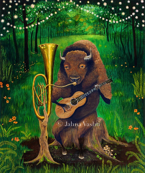 'One Man Bison Band' is an incredible addition to the already stellar Jahna Vashti line-up. She has a way of bringing such character and personality to each of her paintings, but this bison really does it for me. Sitting on a tree trunk in the middle of the forest with lights strung from his tree, his instruments ready to rock, he really sets the stage for an amazing evening, doesn't he?